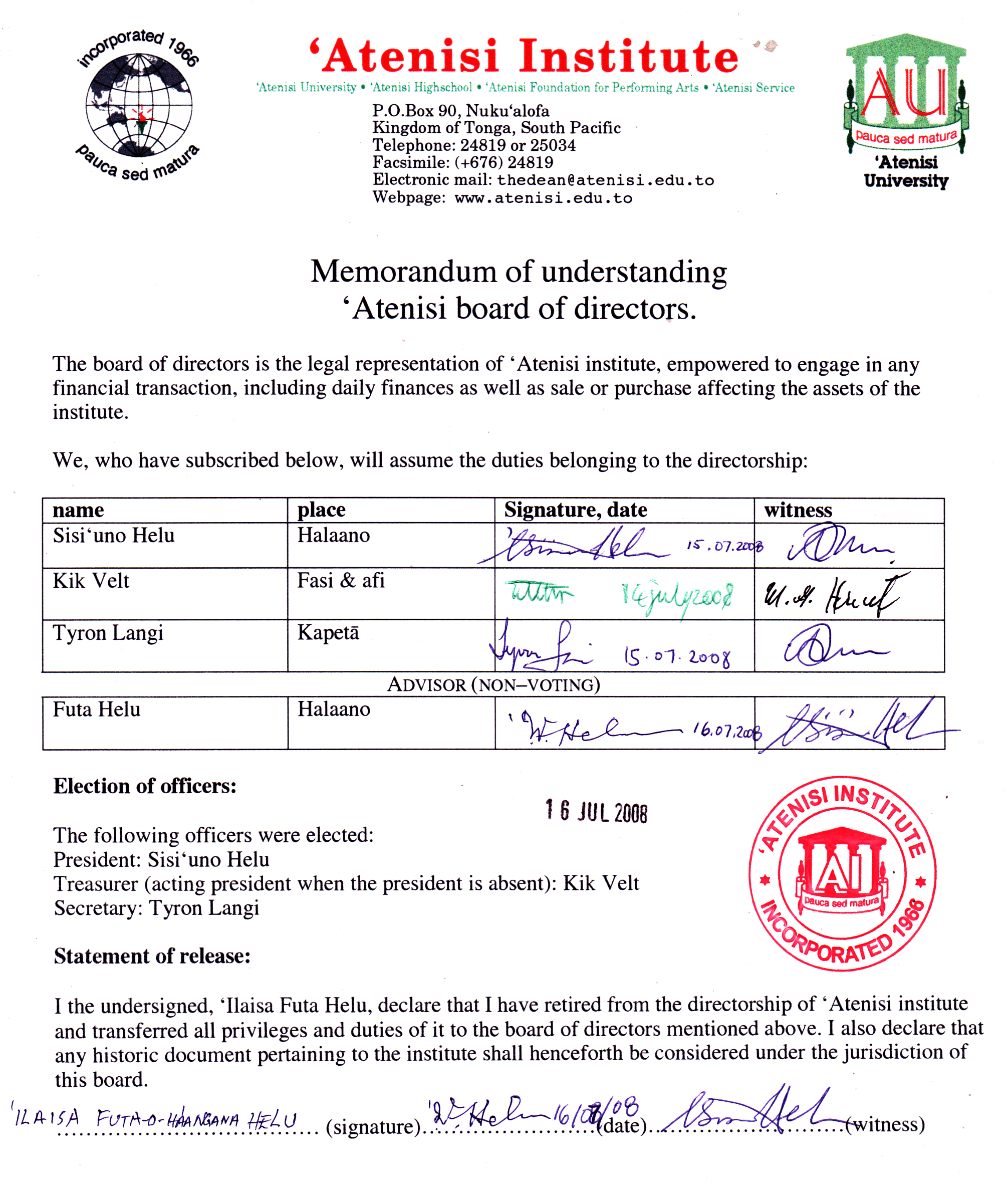 - Notwithstanding the foregoing, it shall be acknowledged at all material times that the Founder of the ʻATENISI INSTITUTE is ʻIlaisa Futa-ʻi-Haʻangana Helu and that his position as a Member is regarded as an Honorary Life Member of the ʻATENISI INSTITUTE.